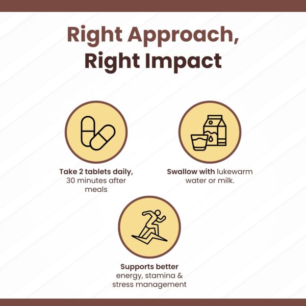 Ashwagandha ek natural adaptogen hai jo cortisol (stress hormone) ko control karne me madad karta hai. Regular use se tension, ghabrahat aur mental pressure kam hota hai.